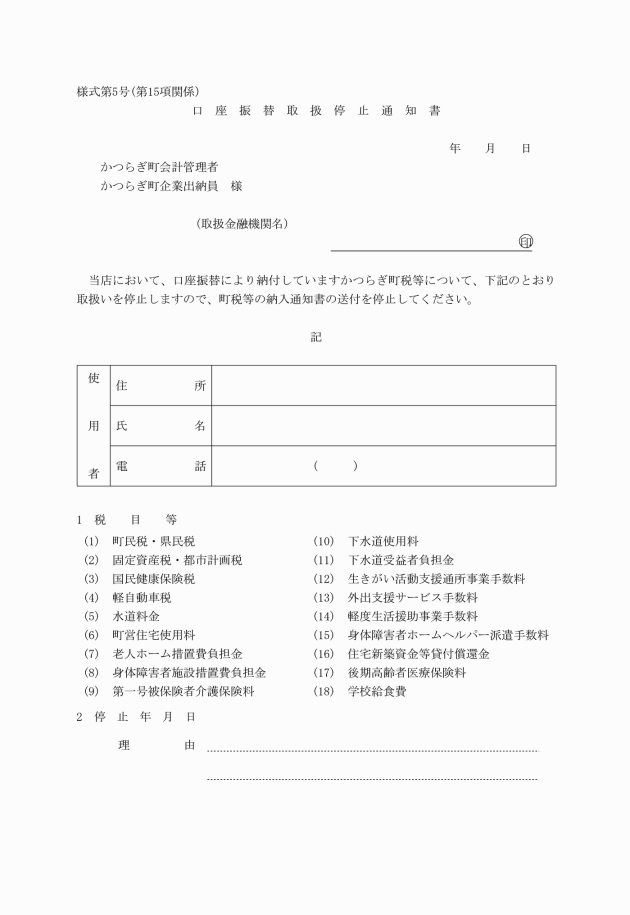 (2) 取扱金融機関は、停止届を受理したとき又は口座振替を取り消したときは、かつらぎ町会計管理者又はかつらぎ町企業出納員に口座振替取扱停止通知書(様式第5号)を送付する。