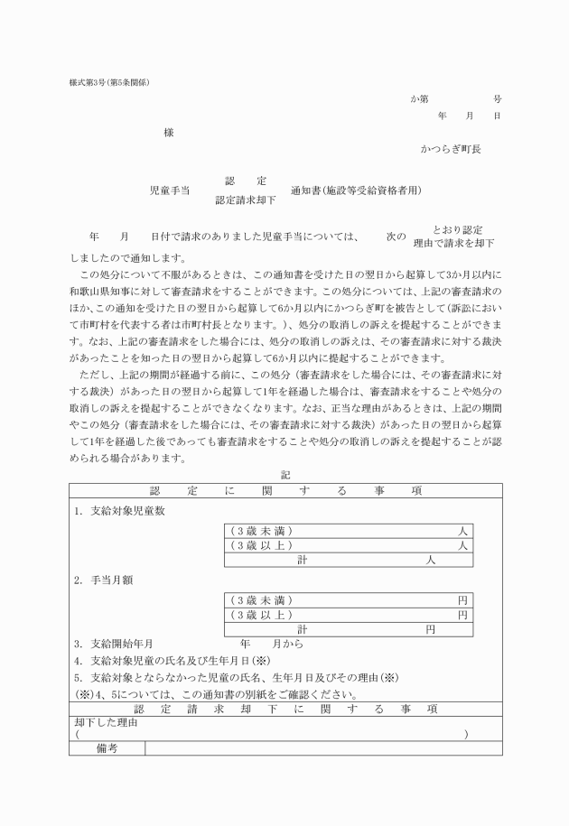 2 認定請求書(施設等受給資格者用)の内容を審査し、受給資格があると認めた場合には認定通知書(施設等受給資格者用)を、受給資格がないものと認めた場合には認定請求却下通知書(施設等受給資格者用)を、様式第3号を用いて、請求者に通知するものとする。