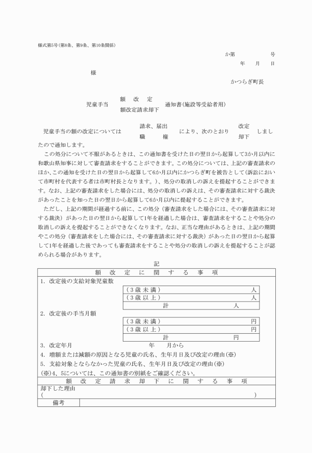 第8条 町長は、施行規則第2条第3項の額改定認定請求書(施設等受給者用)の提出を受けたときは、その内容を審査し、支給額を改定すべきと認めた場合には額改定通知書(施設等受給者用)を、支給額を改定しないと認めた場合には額改定請求却下通知書(施設等受給者用)を、様式第5号を用いて、請求者に通知するものとする。
