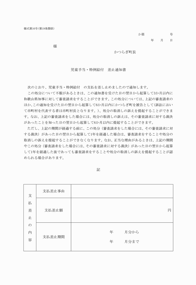 第12条 町長は、施行規則第4条第4項の現況届(施設等受給者用)の提出を受けたときは、当該届書の記載事項等により審査し、支給事由が消滅したものと確認した場合には、当該届書をもって児童手当の認定を取り消し、様式第7号を用いて、支給事由消滅通知書(施設等受給者用)を、当該届出者に通知すること。