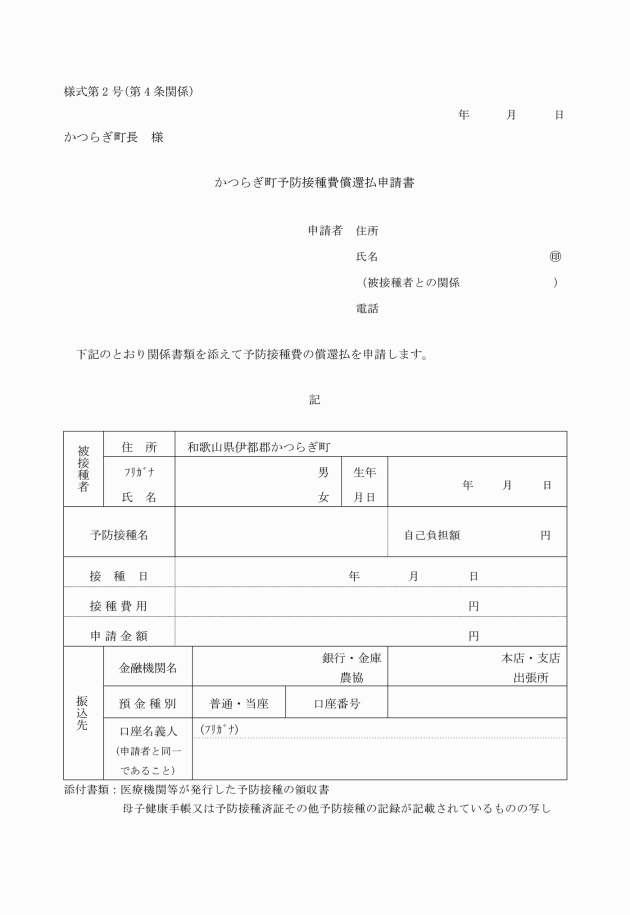 第4条 償還払を受けようとする者は、かつらぎ町予防接種費償還払申請書(様式第2号。以下「申請書」という。)に次に掲げる書類を添付して、町長に提出しなければならない。