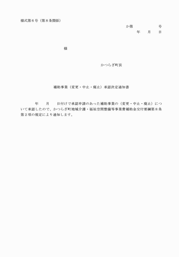 第9条 補助事業者は、補助金の交付決定前に事業に着手しようとするときは、かつらぎ町地域介護・福祉空間整備等事業費補助金交付決定前着手届(様式第7号)を遅滞なく町長に提出しなければならない。